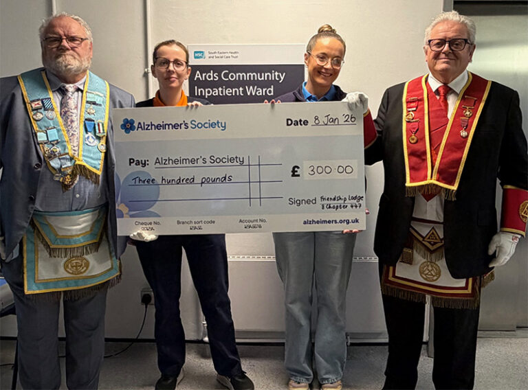 W/Brother Stephen Arnold (W/ Master) of Friendship Masonic Lodge No 447 along with Very Excellent Companion Harry Thompson of Friendship RAC No 447 (Director of Ceremonies) presenting a Cheque…